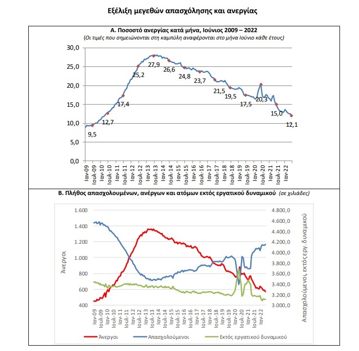 -Το εποχικά διορθωμένο ποσοστό ανεργίας τον Ιούνιο του 2022 ανήλθε σε 12,1% έναντι 15,0% τον Ιούνιο του 2021 και 12,5% τον Μάιο του 2022.