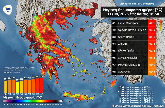 Υψηλές θερμοκρασίες καταγράφηκαν στην χώρα τη Δευτέρα 11/08, με τη μέγιστη θερμοκρασία να φτάνει τους 42 °C.