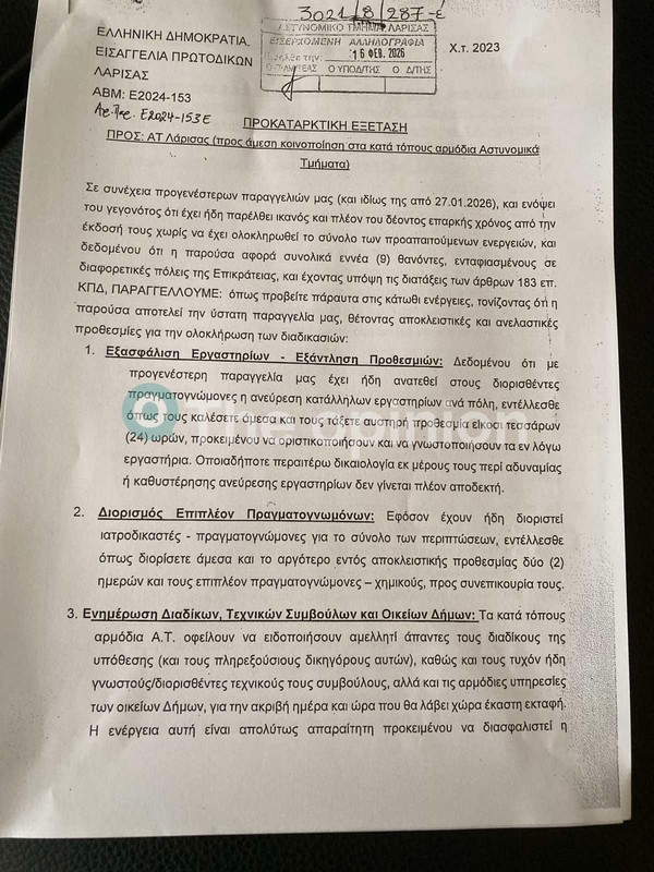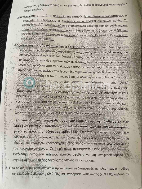 Με το έγγραφό της, ζητά, μάλιστα, να κληθούν εντός 24 ωρών οι πραγματογνώμονες, οι ιατροδικαστές που έχουν διοριστεί, προκειμένου να οριστικοποιήσουν και να γνωστοποιήσουν τα κατάλληλα εργαστήρια που έχουν εντοπίσει.