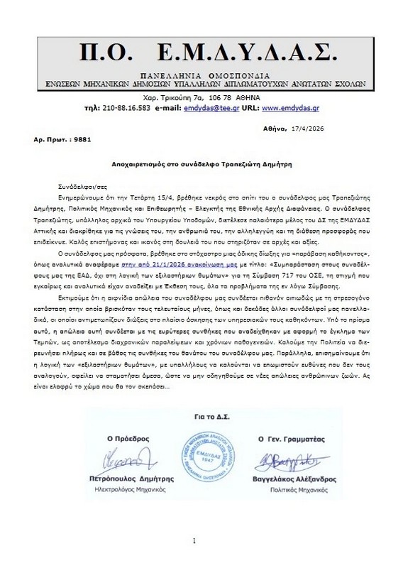 Ο συνάδελφος μας πρόσφατα, βρέθηκε στο στόχαστρο μιας άδικης δίωξης για «παράβαση καθήκοντος», όπως αναλυτικά αναφέραμε στην από 21/1/2026 ανακοίνωση μας με τίτλο: «Συμπαράσταση στους συναδέλφους μας της ΕΑΔ, όχι στη λογική των εξιλαστήριων θυμάτων» για τη Σύμβαση 717 του ΟΣΕ, τη στιγμή που εγκαίρως και αναλυτικά είχαν αναδείξει με Έκθεση τους, όλα τα προβλήματα της εν λόγω Σύμβασης.
