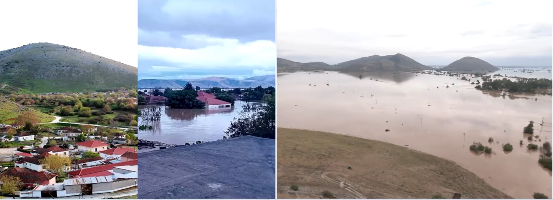 Το μέγεθος της καταστροφής είναι τέτοιο που το χωριό Βλοχός Καρδίτσας, που φαίνεται ανάμεσα στα βουνά, έχει βυθιστεί κάτω από το νερό.