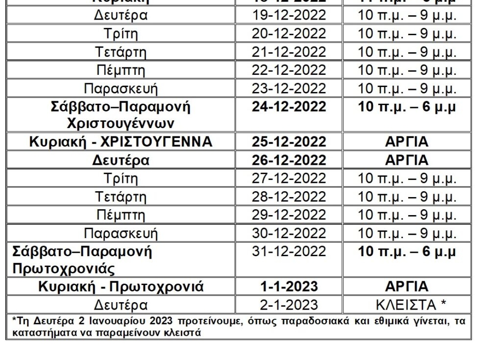 Τα εμπορικά καταστήματα θα κλείσουν στις 21:00, ενώ την παραμονή Χριστουγέννων θα κλείσουν στις 20:00.