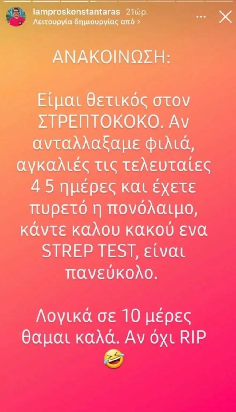 «Ανακοίνωση: Είμαι θετικός στον στρεπτόκοκκο. Αν ανταλλάξαμε φιλιά, αγκαλιές τις τελευταίες 4-5 ημέρες και έχετε πυρετό ή πονόλαιμο, κάντε καλού κακού ένα STREP TEST, είναι πανεύκολο. Λογικά σε 10 μέρες θα είμαι καλά. Αν όχι RIP», έγραψε ο Λάμπρος Κωνσταντάρας.