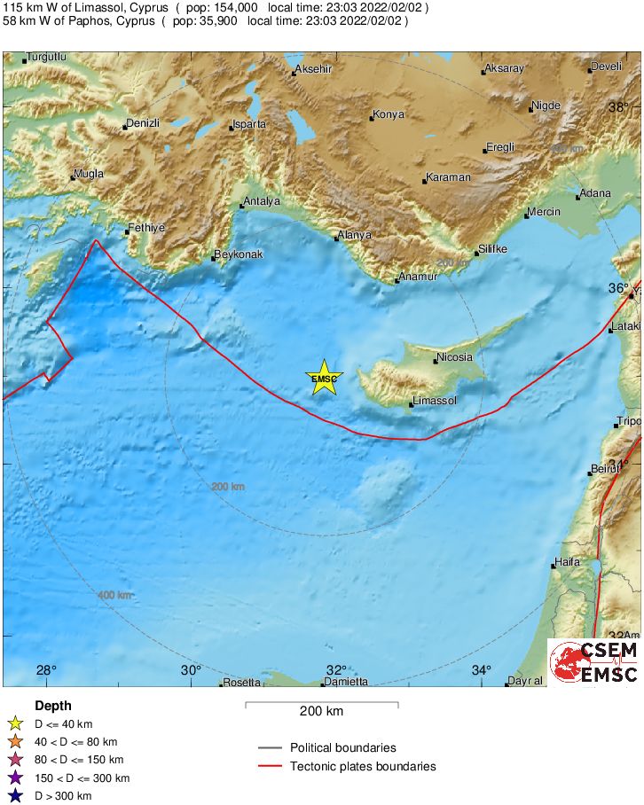 Από την πλευρά του το Ευρωμεσογειακό Ινστιτούτο κάνει λόγο για σεισμική δόνηση ύψος 5,1 της κλίμακας Ρίχτερ με εστιακό βάθος τα 65 χλμ., ο οποίος εντοπίζεται 58 χλμ. δυτικά της Πάφου.