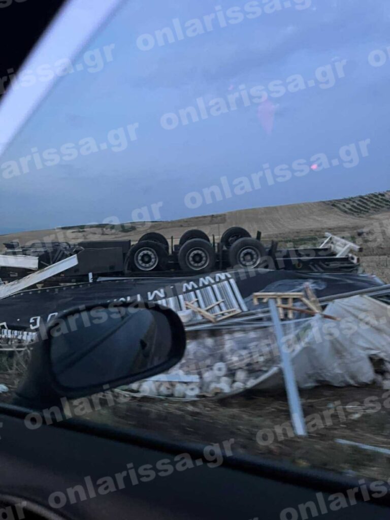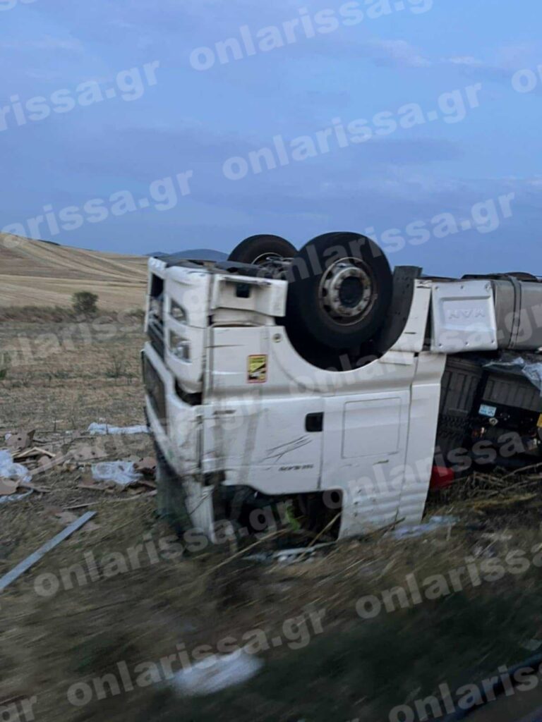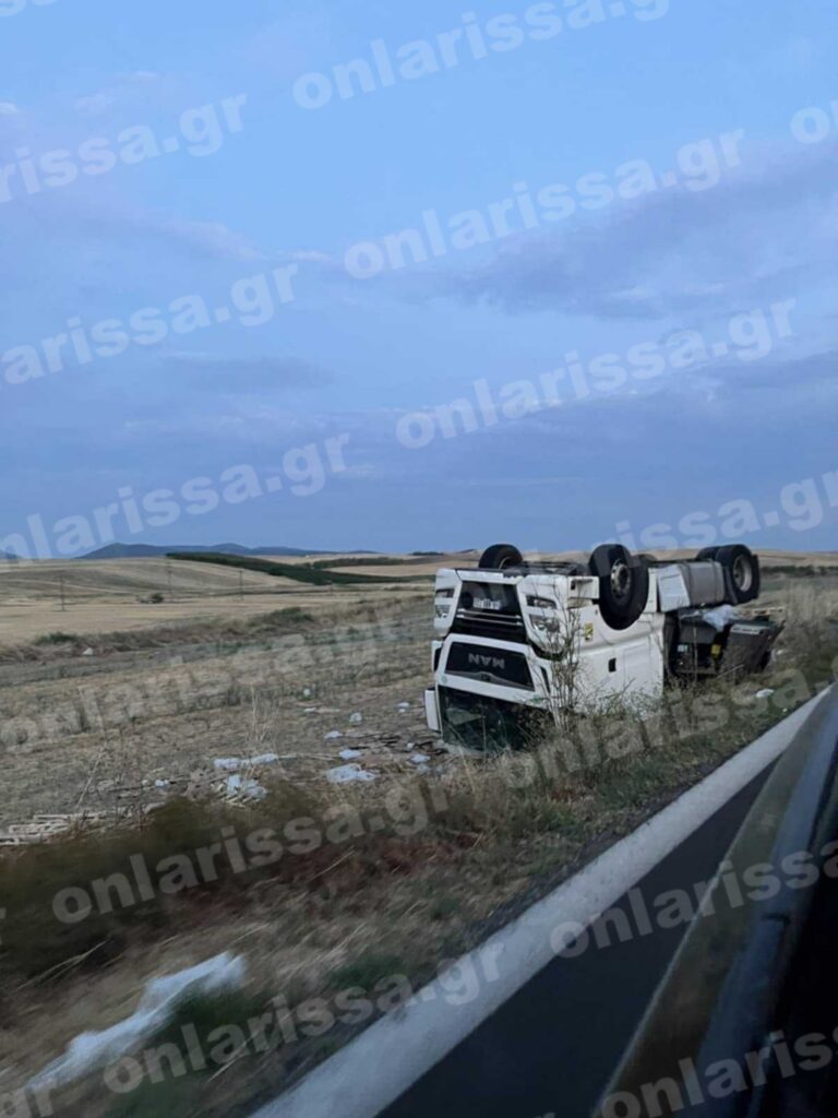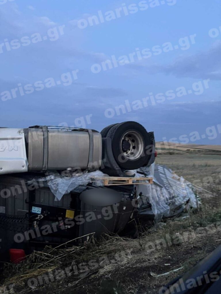 Όπως φαίνεται στις φωτογραφίες του onlarissa.gr, το βαρύ όχημα εξετράπη της πορείας του κάτω από άγνωστες συνθήκες και αναποδογύρισε η καμπίνα.