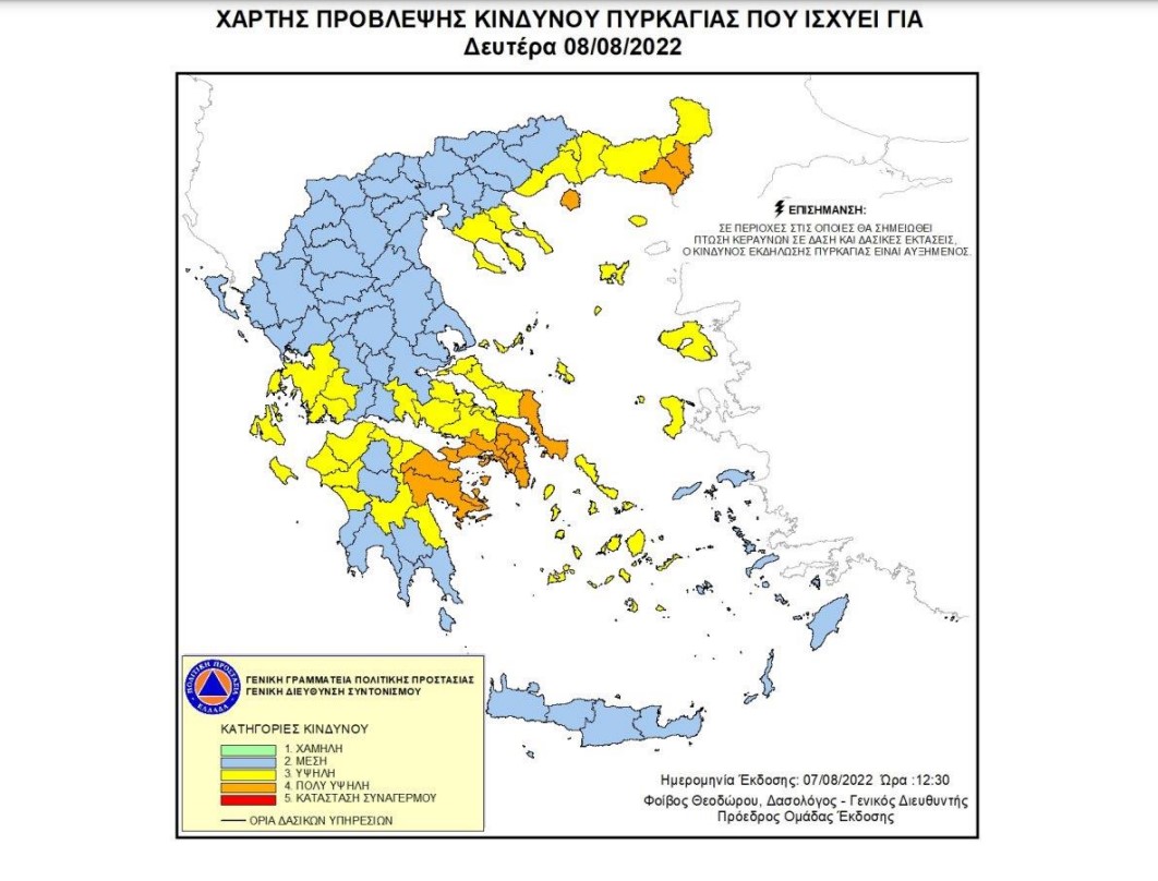 Παράλληλα προβλέπεται πολύ υψηλός κίνδυνος πυρκαγιάς (κατηγορία κινδύνου 4) για τις εξής περιοχές: