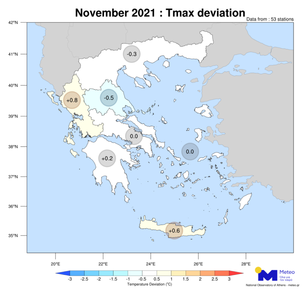 Πιο συγκεκριμένα, αρχικά τις μεγαλύτερες θετικές αποκλίσεις κατέγραψαν οι μετεωρολογικοί σταθμοί στην Ήπειρο (Ιωάννινα) και τη Μακεδονία (Φλώρινα και Πολύγυρος) όπου η μέγιστη θερμοκρασία στις 5 και 6 Νοεμβρίου κυμάνθηκε έως και 11°C πάνω από τα φυσιολογικά για την εποχή επίπεδα. Αργότερα, στο δεύτερο και στην αρχή του τρίτου δεκαημέρου του μήνα η μέγιστη θερμοκρασία ήταν ελαφρώς χαμηλότερη από τον μέσο όρο της περιόδου 2010-2019 και στους 53 μετεωρολογικούς μας σταθμούς. Στην Κεντρική Μακεδονία (Κιλκίς) και τη Θεσσαλία (Τρίκαλα) στις 24-25-26 Νοεμβρίου η μέγιστη θερμοκρασία κυμάνθηκε έως και 7°C κάτω από τα κανονικά για την εποχή επίπεδα.