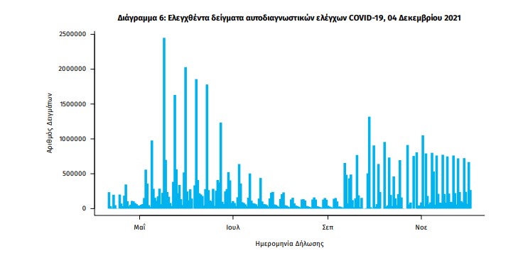 Αυτοδιαγνωστικοί έλεγχοι (Self-tests): Έως 03 Δεκεμβρίου 2021, έχουν καταγραφεί ηλεκτρονικά 58.503.742 δηλώσεις αποτελέσματος αυτοδιαγνωστικού ελέγχου, ενώ 3.375.926 άτομα προσήλθαν για επανέλεγχο.