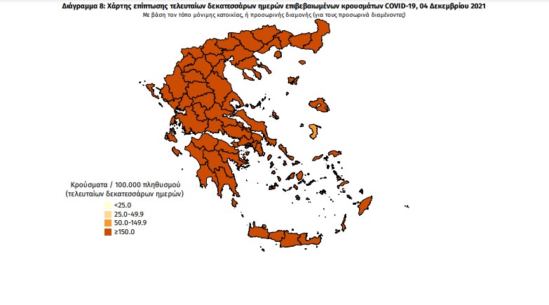 Γεωγραφική διασπορά: Ο χάρτης αποτυπώνει τη γεωγραφική κατανομή των συνολικών κρουσμάτων COVID-19 (από την αρχή της επιδημίας) ανά Περιφερειακή Ενότητα της χώρας, με βάση την δηλωθείσα διεύθυνση μόνιμης κατοικίας του ασθενούς, ή τη διεύθυνση προσωρινής διαμονής για τους τουρίστες και άλλους προσωρινά διαμένοντες στην Ελλάδα. Συμπεριλαμβάνονται τόσο κρούσματα με ιστορικό ταξιδίου (“εισαγόμενα”) όσο και κρούσματα με πιθανή εγχώρια μετάδοση.