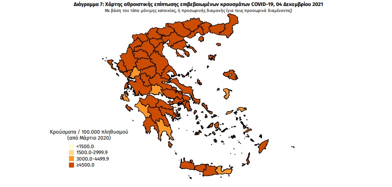Γεωγραφική διασπορά: Ο χάρτης αποτυπώνει τη γεωγραφική κατανομή των συνολικών κρουσμάτων COVID-19 (από την αρχή της επιδημίας) ανά Περιφερειακή Ενότητα της χώρας, με βάση την δηλωθείσα διεύθυνση μόνιμης κατοικίας του ασθενούς, ή τη διεύθυνση προσωρινής διαμονής για τους τουρίστες και άλλους προσωρινά διαμένοντες στην Ελλάδα. Συμπεριλαμβάνονται τόσο κρούσματα με ιστορικό ταξιδίου (“εισαγόμενα”) όσο και κρούσματα με πιθανή εγχώρια μετάδοση.