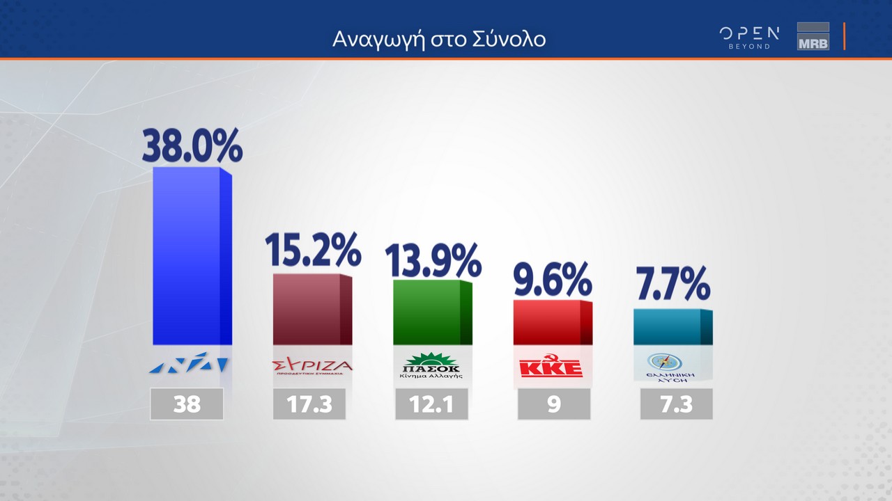 Σύμφωνα με την δημοσκόπηση της MRB προβάδισμα 18,1 ποσοστιαίων μονάδων διατηρεί η Νέα Δημοκρατία έναντι του ΣΥΡΙΖΑ.