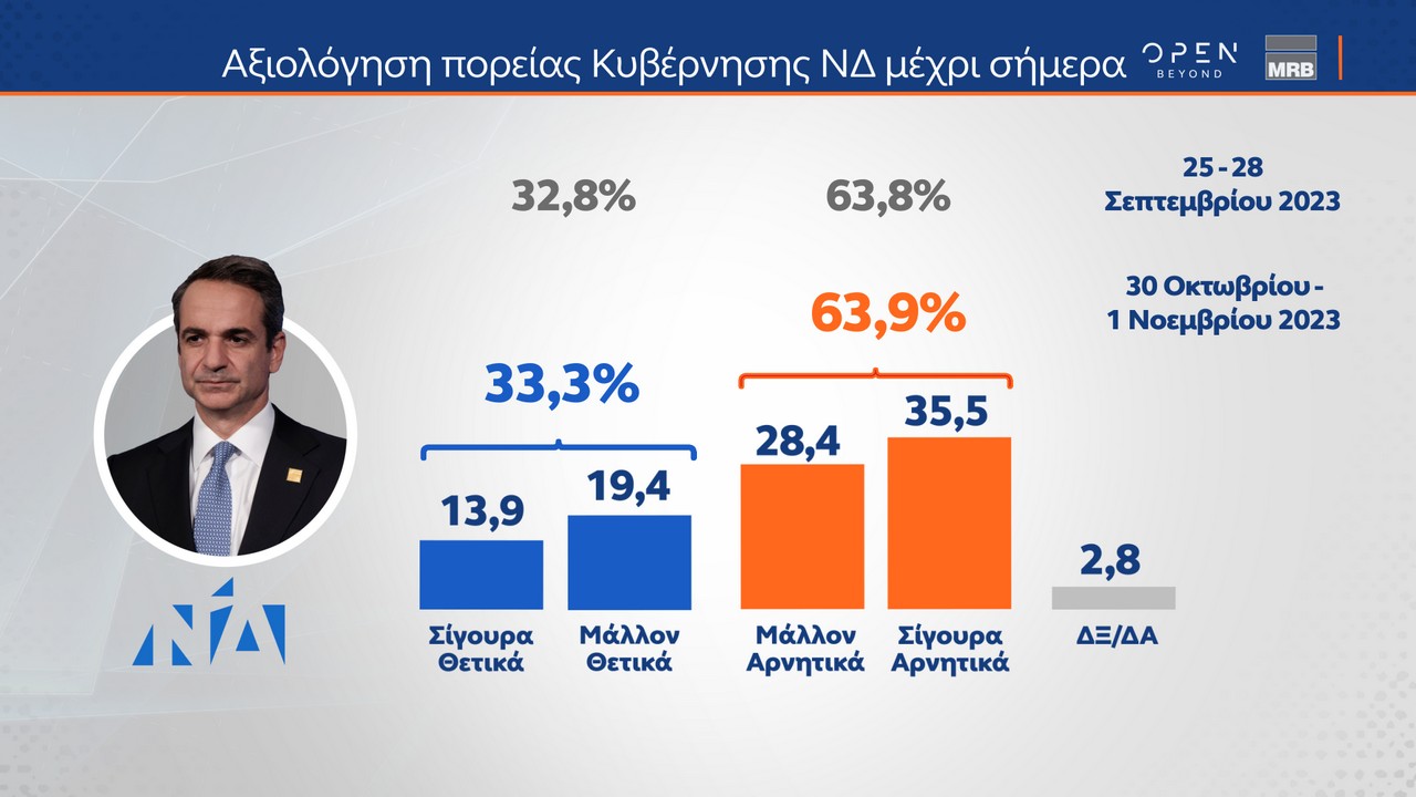 Το 63,9% αξιολογεί αρνητικά την πορεία της κυβέρνησης, ενώ το 33,3% την αξιολογεί θετικά.