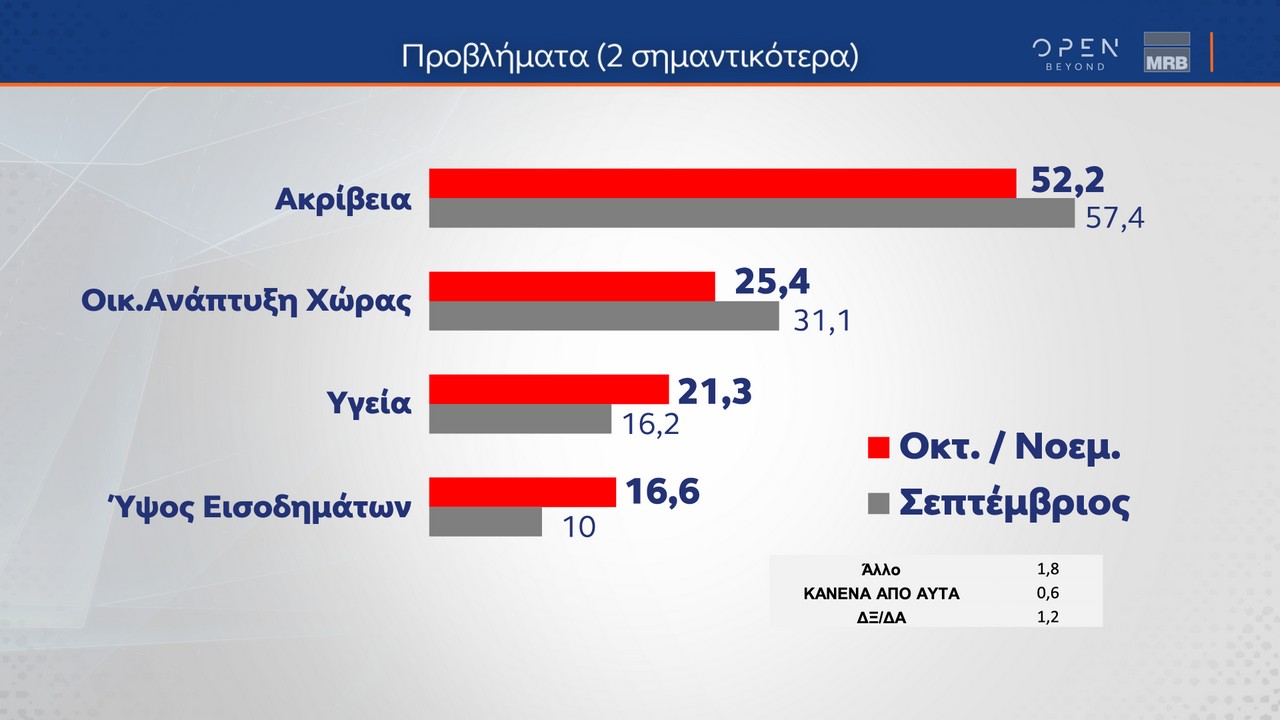 Ως μεγαλύτερο πρόβλημα αξιολογείται η ακρίβεια σε ποσοστό 52,2%, η οικονομική ανάπτυξη σε ποσοστό 25,4%, η Υγεία σε ποσοστό 21,3%, το ύψος των εισοδημάτων σε ποσοστό 16,6%.