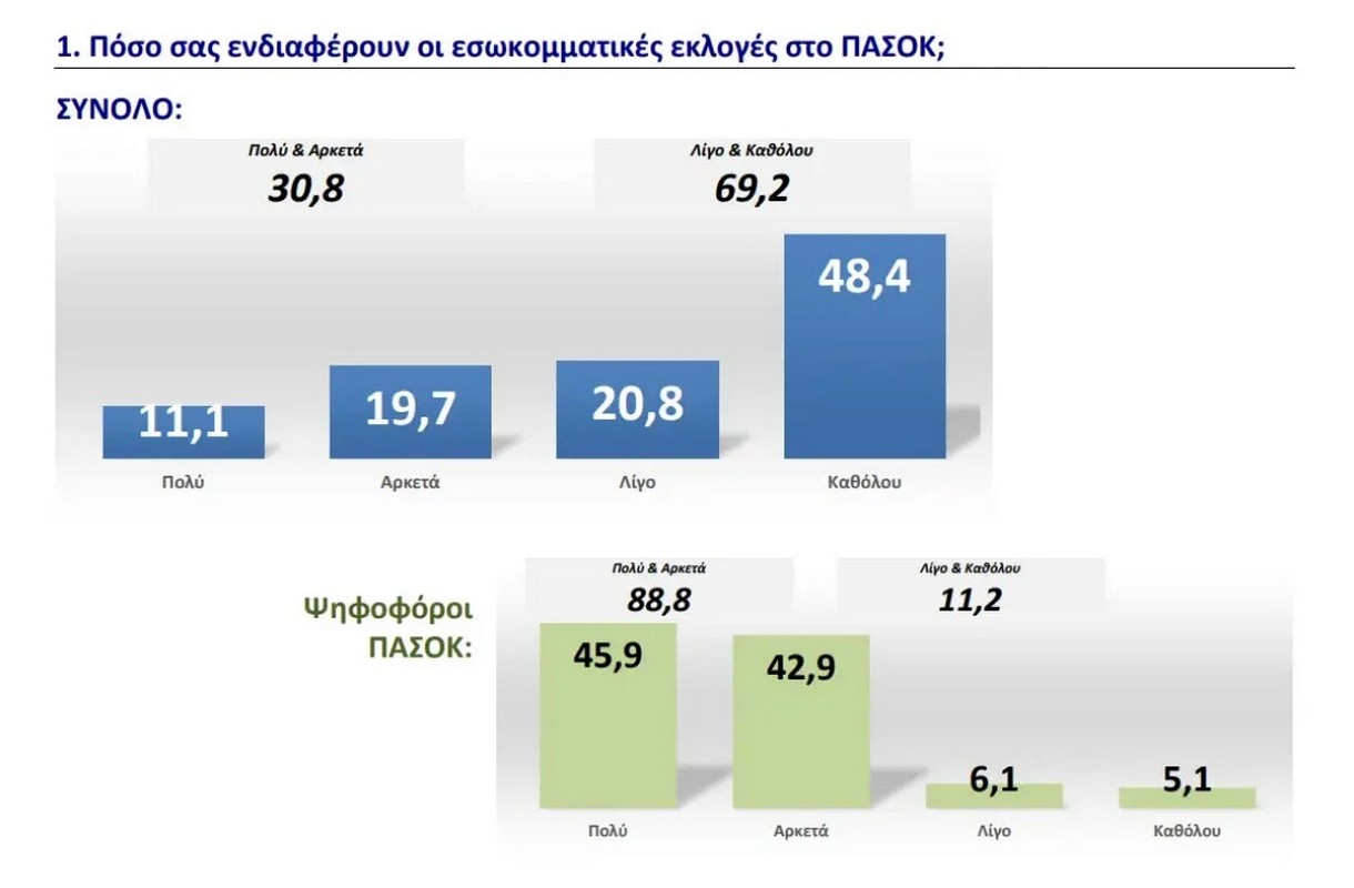 Στο κοινό όσων δήλωσαν ότι θα ψηφίσουν στις εσωκομματικές εκλογές (ναι και μάλλον ναι) ο Ν. Ανδρουλάκης είναι πρώτος με 30,1%, ακολουθεί ο Χάρης Δούκας με 21,9%, τρίτος ο Παύλος Γερουλάνος με 19,7% ενώ πολύ κοντά είναι η Άννα Διαμαντοπούλου με 19,2%.