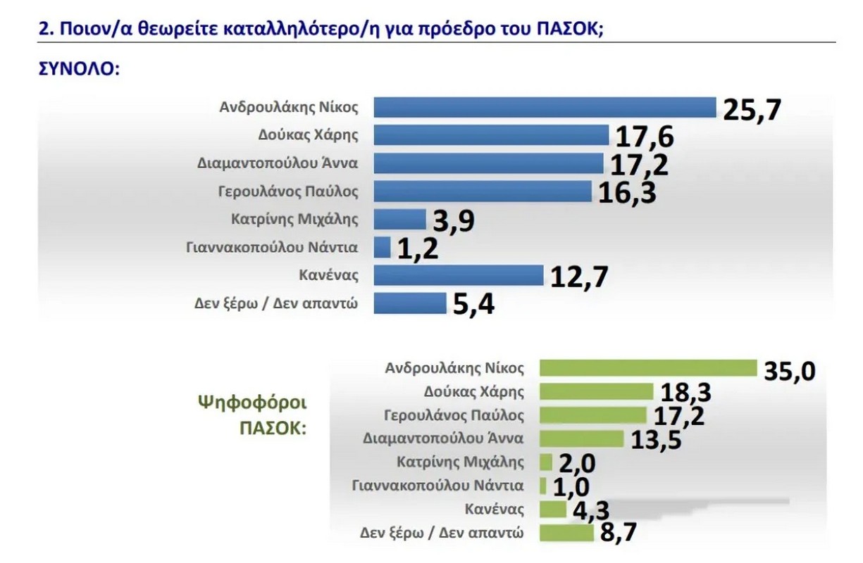 Ειδικότερα, στο ερώτημα ποιον θεωρείτε καταλληλότερο/η για πρόεδρο του ΠΑΣΟΚ, ο Νίκος Ανδρουλάκης έρχεται πρώτος με 25,7%. Ο Χάρης Δούκας συγκεντρώνει 17,6%, η Άννα Διαμαντοπούλου από κοντά με 17,2% και ο Παύλος Γερουλάνος με 16,3%.
