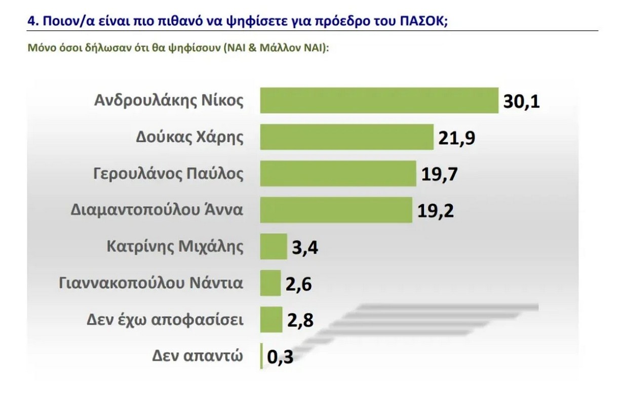 Στο κοινό όσων δήλωσαν ότι θα ψηφίσουν στις εσωκομματικές εκλογές (ναι και μάλλον ναι) ο Ν. Ανδρουλάκης είναι πρώτος με 30,1%, ακολουθεί ο Χάρης Δούκας με 21,9%, τρίτος ο Παύλος Γερουλάνος με 19,7% ενώ πολύ κοντά είναι η Άννα Διαμαντοπούλου με 19,2%.