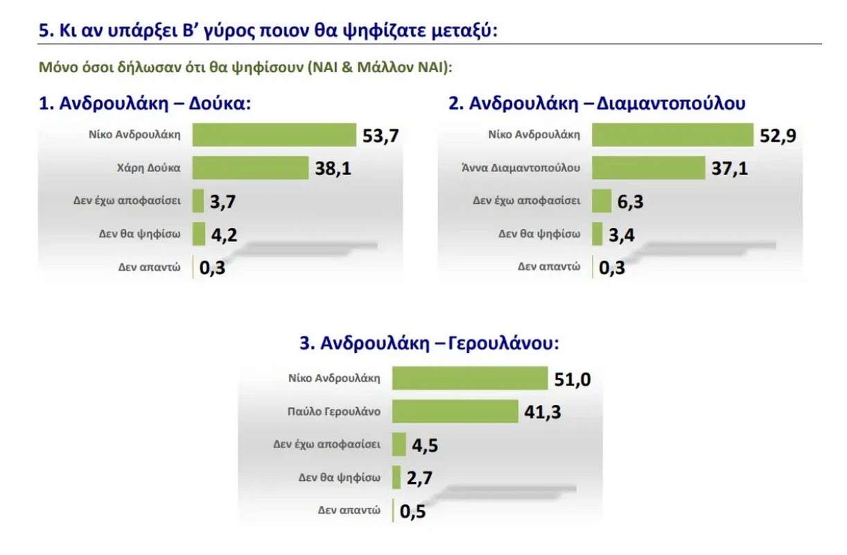 Σε ενδεχόμενο β’ γύρο των εκλογών, ο Νίκος Ανδρουλάκης δείχνει να κερδίζει όλους τους αντιπάλους στον δεύτερο γύρο σε όλα τα δυνητικά εκλογικά σώματα, όμως θα ισοψηφούσε στο ευρύτερο σώμα και θα έχανε στο σώμα αυτών που σίγουρα θα πάνε να ψηφίσουν. Αμφίρροπη θα ήταν η μάχη ανάμεσα στον Χάρη Δούκα και την Άννα Διαμαντοπούλου, καθώς θα έχανε από αυτήν στο ευρύ σώμα και στο στο σώμα όσων σίγουρα θα ψήφιζαν, ενώ θα κέρδιζε στο σώμα των ψηφοφόρων του ΠΑΣΟΚ. Ο Παύλος Γερουλάνος θα κέρδιζε τον Χάρη Δούκα και την Άννα Διαμαντοπούλου σε όλα τα πιθανά εκλογικά σώματα, εκτός από το ευρύ όπου θα κέρδιζε η Διαμαντοπούλου.