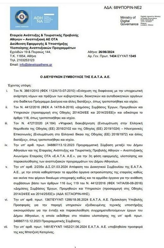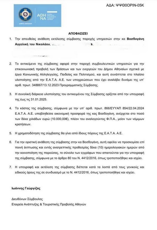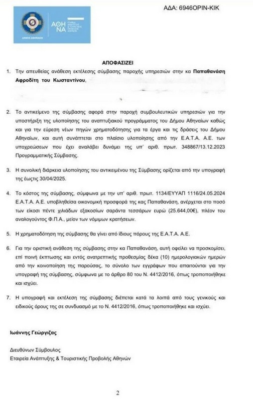 Η δεύτερη περίπτωση είναι η Αφροδίτη Παπαθανάση, με την οποία ο δήμος Αθηναίων υπέγραψε απευθείας ανάθεση εκτέλεσης σύμβασης παροχής υπηρεσιών ύψους 25.644 ευρώ, με αντικείμενο την παροχή συμβουλευτικών υπηρεσιών.