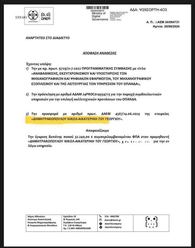 Για την αναβάθμιση του Οργανισμού Πολιτισμού, Αθλητισμού και Νεολαίας του δήμου Αθηναίων (ΟΠΑΝΔΑ), η παροχή συμβουλευτικών υπηρεσιών για την επιλογή καλλιτεχνικών προτάσεων ανατέθηκε απευθείας στη Νικόλ – Αικατερίνη Δημητρακοπούλου, ύψους 32.240 ευρώ.