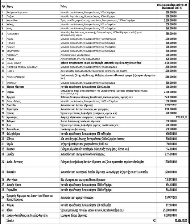 Ειδικότερα, το ποσό δεσμεύθηκε από το Τομεακό Πρόγραμμα Ανάπτυξης 2025 του υπουργείου Περιβάλλοντος και Ενέργειας και αφορά, μεταξύ άλλων, στη δημιουργία και τον εκσυγχρονισμό μονάδων αφαλάτωσης, στη βελτίωση και αντικατάσταση δικτύων ύδρευσης, σε δράσεις αξιοποίησης πηγαίων νερών (αγωγοί, ταχυδιυλιστήρια) κ.ά.