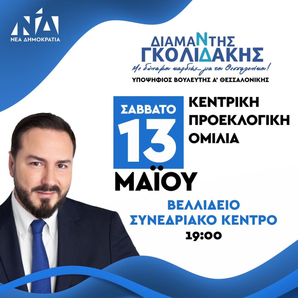 Την κεντρική του προεκλογική ομιλία θα πραγματοποιήσει στο Βελλίδειο Συνεδριακό Κέντρο το Σάββατο 13 Μαΐου στις 19:00 ο υποψήφιος βουλευτής Α΄ Θεσσαλονίκης με τη Νέα Δημοκρατία και ειδικός καρδιολόγος Διαμαντής Γκολιδάκης.