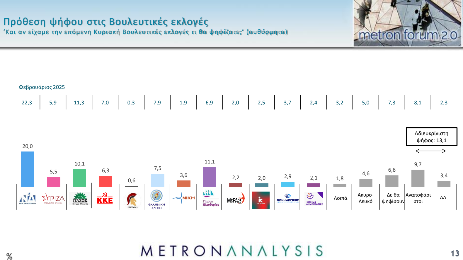 Από την άλλη πλευρά, η δημοσκόπηση της Metron Analysis εμφανίζει διαφοροποιήσεις, καθώς καταγράφει τη Νέα Δημοκρατία να προηγείται με διαφορά 11,8 μονάδων, αλλά με τη δεύτερη θέση να ανήκει στην Πλεύση Ελευθερίας, η οποία παρουσιάζει άνοδο 5,7 μονάδων και φτάνει το 12%. Το ΠΑΣΟΚ συνεχίζει την πτωτική του πορεία, υποχωρώντας στο 11,5%. Αξιοσημείωτο είναι ότι στην ίδια έρευνα, η Νίκη εμφανίζει ενίσχυση των ποσοστών της, φτάνοντας το 4,7%, ξεπερνώντας τη Φωνή Λογικής, η οποία πέφτει στο 3,9%.