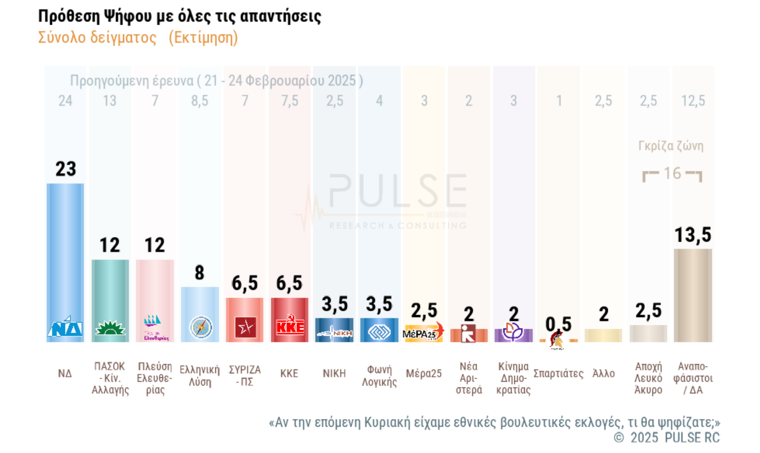 Στη δημοσκόπηση της PULSE, που πραγματοποιήθηκε από τις 16 έως τις 18 Μαρτίου σε δείγμα 1.144 ατόμων, η ΝΔ συγκεντρώνει 23%, καταγράφοντας μικρή μείωση των ποσοστών της. Στη δεύτερη θέση βρίσκονται το ΠΑΣΟΚ και η Πλεύση Ελευθερίας, αμφότερα με 12%. Η Πλεύση Ελευθερίας σημειώνει άνοδο πέντε μονάδων σε σχέση με την προηγούμενη μέτρηση (21-24 Φεβρουαρίου), ενώ το ΠΑΣΟΚ καταγράφει πτώση μιας μονάδας. Στην τρίτη θέση βρίσκεται η Ελληνική Λύση με 8%, ενώ ακολουθούν ο ΣΥΡΙΖΑ και το ΚΚΕ με 6,5%. Η Νίκη και η Φωνή Λογικής συγκεντρώνουν από 3,5%, το ΜέΡΑ25 2,5%, ενώ η Νέα Αριστερά και το Κίνημα Δημοκρατίας λαμβάνουν από 2%. Το ποσοστό των αναποφάσιστων ανέρχεται σε 13,5%.