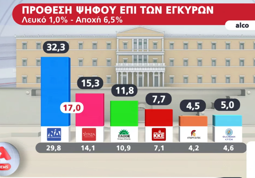 Στην πρόθεση ψήφου η ΝΔ συγκεντρώνει ποσοστό 32,3% έναντι 15,3% του ΣΥΡΙΖΑ, 11,8 του ΠΑΣΟΚ. Ακολουθούν το ΚΚΕ με 7,7%, οι Σπαρτιάτες με 4,5%, η Ελληνική Λύση με 5%.