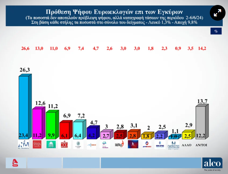 Στην πρόθεση ψήφου, η Νέα Δημοκρατία συγκεντρώνει 26,3% και ο ΣΥΡΙΖΑ έρχεται δεύτερος με 12,6%. Ακολουθούν: ΠΑΣΟΚ με 11,2%, Ελληνική Λύση με 7,2%, ΚΚΕ με 6,9%, Νίκη με 4,7%, Νέα Αριστερά με 3,1%, Πλεύση Ελευθερίας με 3% και ΜέΡΑ25 με 2,8%.
