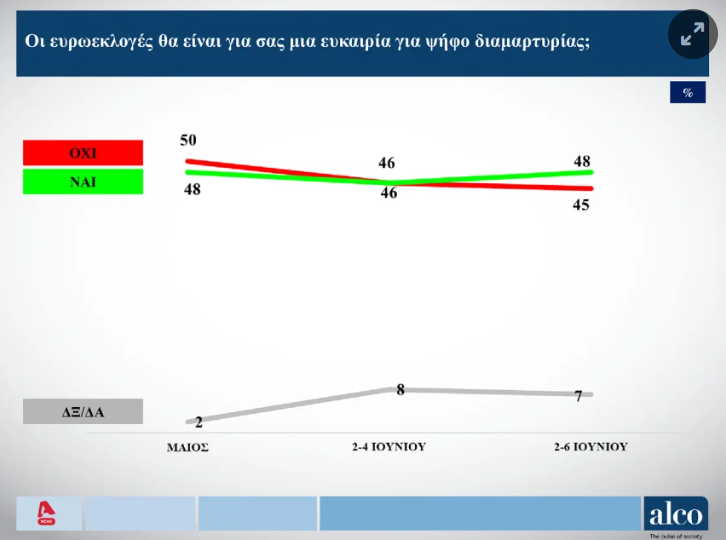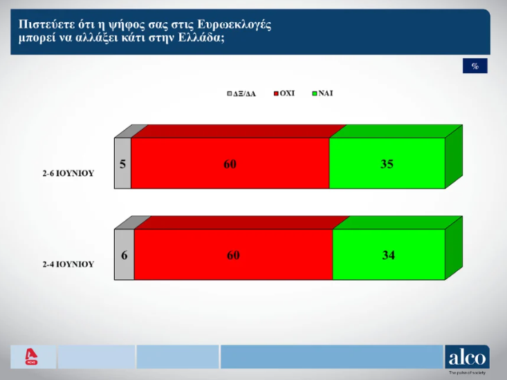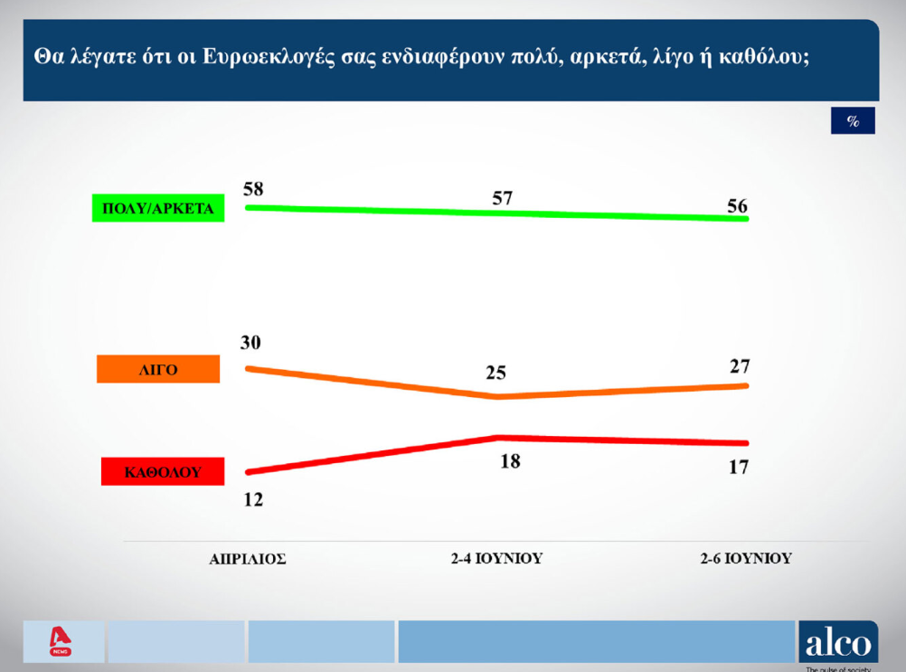 Σε ερώτηση «πόσο σας ενδιαφέρουν οι ευρωεκλογές», το 56% απαντά «πολύ», το 27% «λίγο» και το 17% «καθόλου». Όσο για το αν θεωρούν οι πολίτες ότι η ψήφος τους στις ευρωεκλογές μπορεί να αλλάξει κάτι στην Ελλάδα, το 60% απαντά «όχι» και το 35% «ναι».