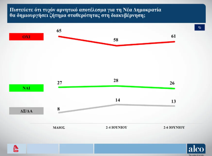 «Μάχη» μεταξύ ΠΑΣΟΚ - ΣΥΡΙΖΑ για τη δεύτερη θέση καταγράφει δημοσκόπηση της ALCO για λογαριασμό του Alpha.