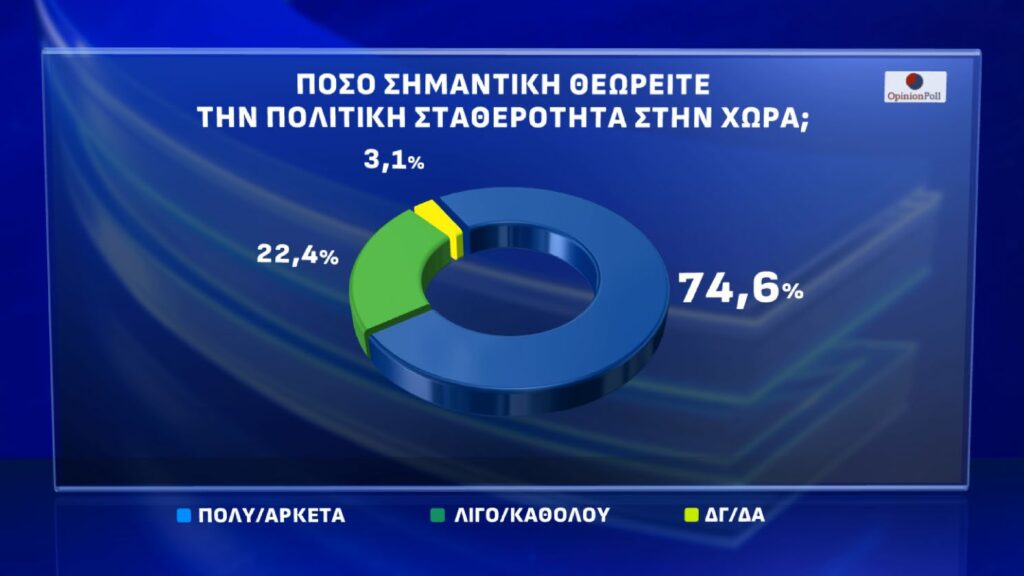 Ταυτόχρονα φαίνεται να επηρεάζει το πολιτικό κλίμα και ότι συμβαίνει στον πλανήτη , με τις γεωστρατηγικές και οικονομικές πρωτοβουλίες Ν. Τραμπ, που τροφοδοτούν ανησυχία και αβεβαιότητα. Αυτό τονώνει την θέληση για την διασφάλιση της πολιτικής σταθερότητας της χώρας . Το 74.6% δηλώνει ότι θεωρεί την διασφάλιση της πολιτικής σταθερότητας στην χώρα αυτή την εποχή των διεθνών αναταράξεων πολύ και αρκετά σημαντική. Λίγο δηλώνει το 10.8% και καθόλου το 11.6%.