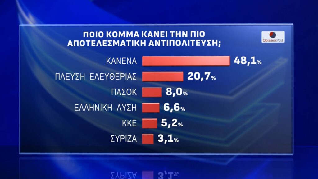 Σ΄αυτή την συγκυρία αναδεικνύεται αδυναμία της Αντιπολίτευσης να αντιδράσει. Στο ερώτημα ποιο κόμμα πιστεύουν οι πολίτες ότι κάνει την πιο αποτελεσματική αντιπολίτευση , το 48.1% δηλώνει ΚΑΝΕΝΑ. Από τα κόμματα που δηλώνονται πρώτη είναι η ΠΛΕΥΣΗ ΕΛΕΥΘΕΡΙΑΣ με 20.7% και ακολουθούν το ΠΑΣΟΚ με 8%, η ΕΛΛΗΝΙΚΗ ΛΥΣΗ με 6.6%, το Κ.Κ.Ε με 5.2% , ο ΣΥΡΙΖΑ με 3.1% , η ΦΩΝΗ ΛΟΓΙΚΗΣ με 1.4% κ.λ.π