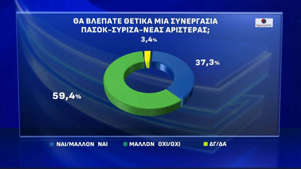 Το 37.3% δηλώνει ότι θα έβλεπε θετικά μια συνεργασία ΠΑΣΟΚ- ΣΥΡΙΖΑ- ΝΕΑΣ ΑΡΙΣΤΕΡΑΣ ,με το 59.4% να έχει αντίθετη άποψη. Θετικό είναι το 70.6% των ψηφοφόρων του ΣΥΡΙΖΑ, ενώ στο ΠΑΣΟΚ που φαίνεται κυριολεκτικά στα δύο, θετικό είναι το 47.8% με αντίθετη άποψη από το 49.6%. Πάντως το ποσοστό μειώνεται στο 30.5% για όσους θεωρούν ότι είναι ρεαλιστική μια τέτοια προοπτική, με το 66.1%