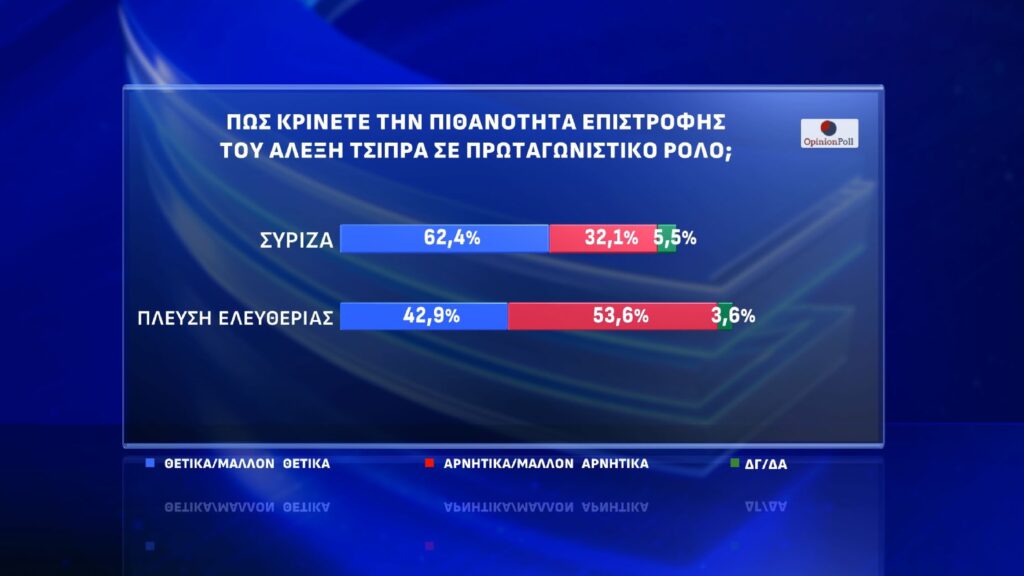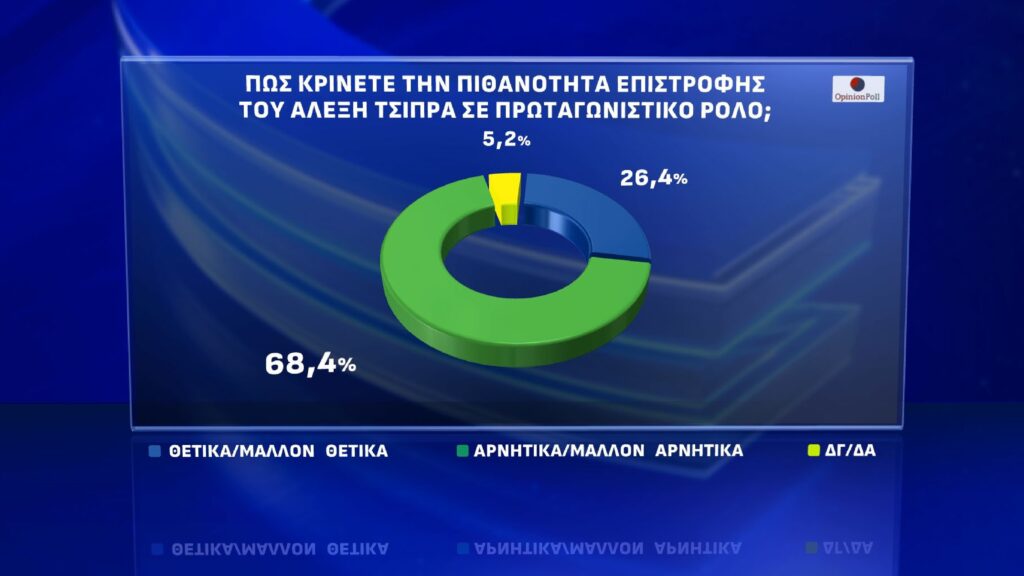 Το 26.4% κρίνει θετικά την πιθανότητα επιστροφής του Α. Τσίπρα σε πιο πρωταγωνιστικό ρόλο, με το 68.4% να την αντιμετωπίζει αρνητικά. Ανάμεσα στους ψηφοφόρους του ΣΥΡΙΖΑ το 62.4% το βλέπει θετικά και το 32.1% αρνητικά.