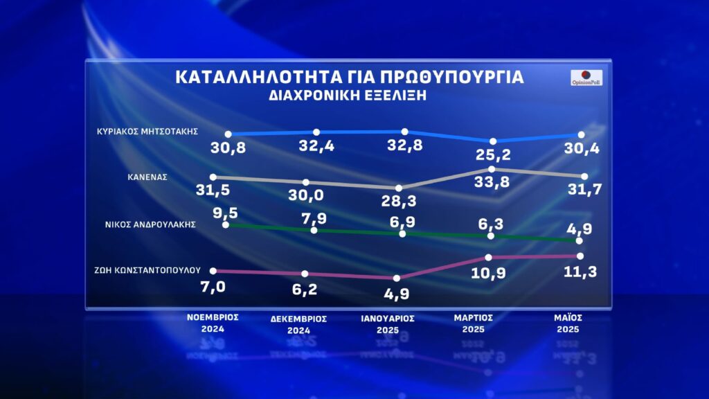- Στην καταλληλότητα για Πρωθυπουργός που σημειώνεται μια σημαντική άνοδος του Κ. Μητσοτάκη κατά 5.2% επιλεγόμενος από το 30.4% και απέχοντας λίγο πια από τον ΚΑΝΕΝΑ που βρίσκεται στο 31.7%. Στην προηγούμενη έρευνα ο ΚΑΝΕΝΑΣ προηγούταν 8.6% ( 33.8% έναντι 25.2%) . Ακολουθούν οι Ζωή Κωνσταντοπούλου με 11.3% ( 10.9%) και ο Ν. Ανδρουλάκης με 4.9% ( 6.3%). Ακολουθούν οι Κ. Βελόπουλος με 5.1%, Δ. Κουτσούμπας με 3.1%, Σ. Φάμελλος με 2.5% ,ο Σ. Κασσελάκης με 1.7% κ.λ.π