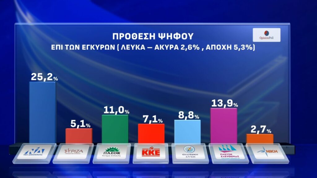 Η πρόθεση ψήφου επί των εγκύρων με λευκά/ άκυρα 2.6% και αποχή 5.3% είναι : Ν.Δ 25.2% , ΠΛΕΥΣΗ ΕΛΕΥΘΕΡΙΑΣ 13.9% , ΠΑΣΟΚ 11%, ΕΛΛΗΝΙΚΗ ΛΥΣΗ 8.8%, Κ.Κ.Ε 7.1%, ΣΥΡΙΖΑ 5.1%, ΝΙΚΗ 2.7%, ΦΩΝΗ ΛΟΓΙΚΗΣ 2.5%, ΚΙΝΗΜΑ ΔΗΜΟΚΡΑΤΙΑΣ 2.3% , ΜΕΡΑ 25 2.2%, ΝΕΑ ΑΡΙΣΤΕΡΑ 1.3%, ΑΛΛΟ 2.1% και αναποφάσιστοι 16%. Η γκρίζα ζώνη στην απλή πρόθεση ψήφου ανέρχεται στο 22.6%.