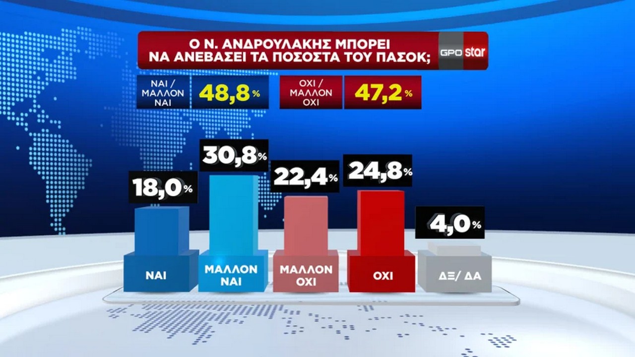 Σε ερώτηση για το αν ο Νίκος Ανδρουλάκης θα ανεβάσει τα ποσοστά του ΠΑΣΟΚ, το 48,8% πιστεύει πως θα το καταφέρει, ενώ μεταξύ των ψηφοφόρων του κόμματος, το 77,3% πιστεύει πως θα τα καταφέρει.