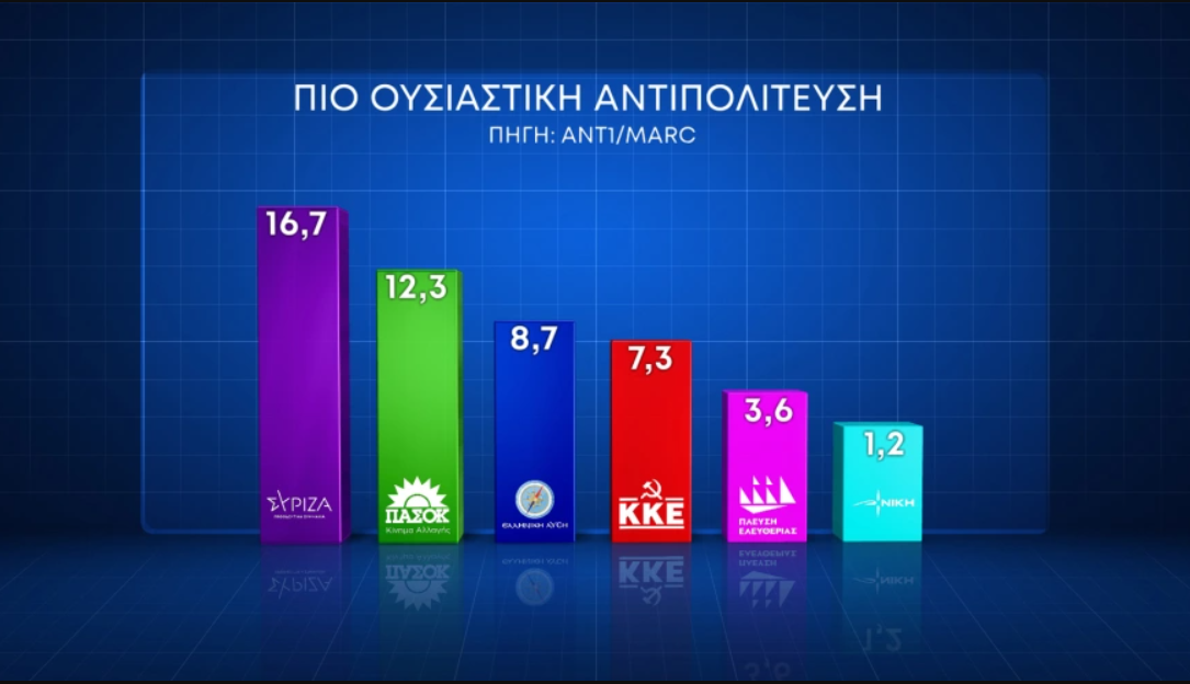 Στην ερώτηση ποιο κόμμα ασκεί την πιο ουσιαστική αντιπολίτευση, πρώτος έρχεται ο ΣΥΡΙΖΑ με 16,7% και μετά το ΠΑΣΟΚ με 12,3%. Στο 47,2% είναι το ποσοστό που απαντά κανένα κόμμα ιδιαίτερα. Με άλλα λόγια, 1 στους 2 θεωρεί πως δεν υπάρχει ικανοποιητική αντιπολίτευση. Σε ό,τι αφορά τη συνολική αξιολόγηση της κυβέρνησης, θετικά και μάλλον θετικά την κρίνει το 40,1% και αρνητικά και μάλλον αρνητικά το 58,9%.