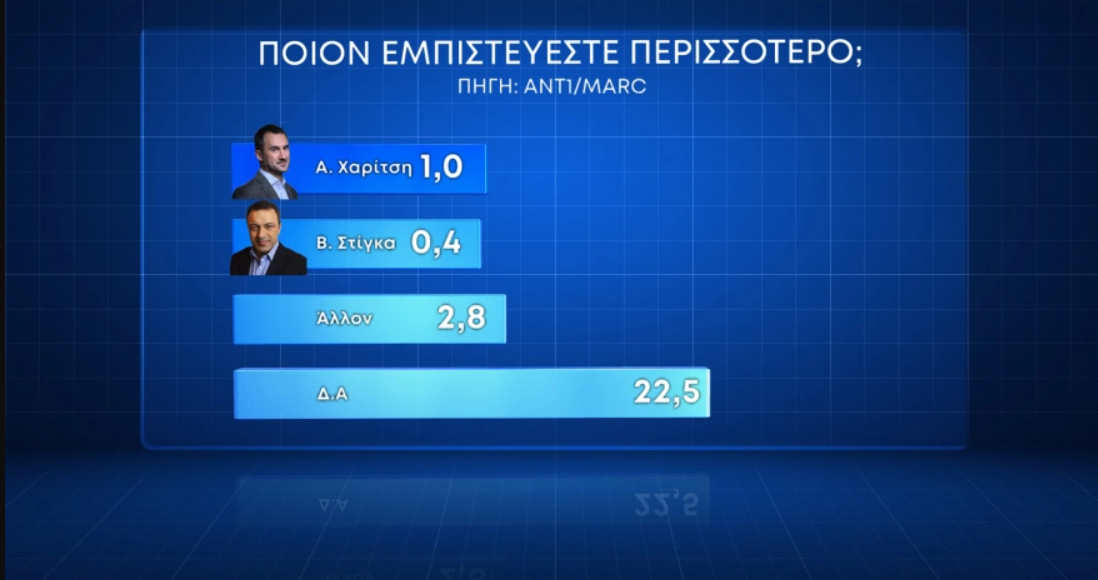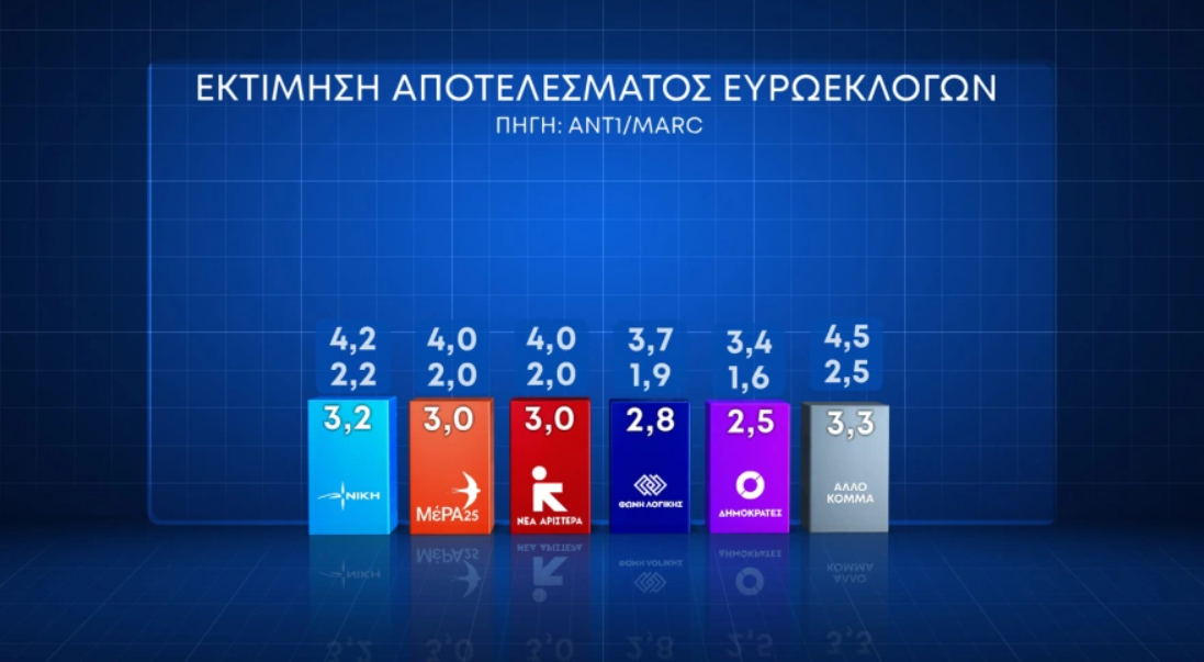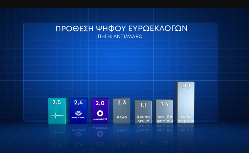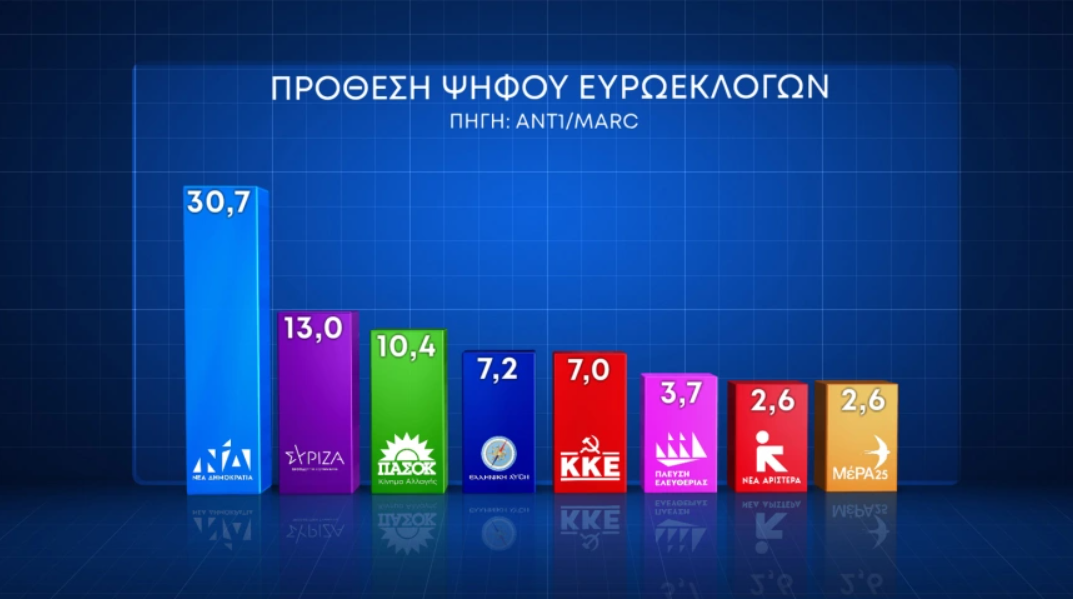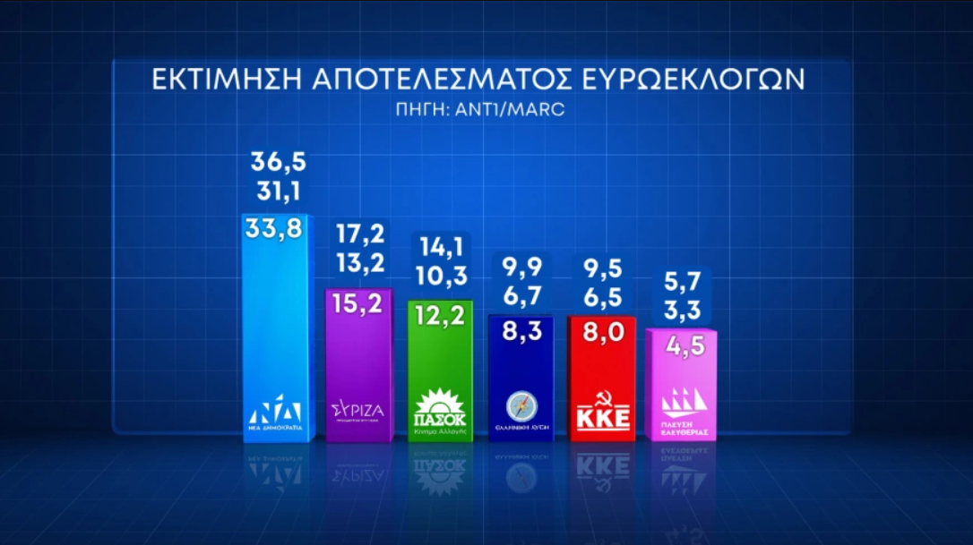 Σύμφωνα με τη δημοσκόπηση της Marc για τις ευρωεκλογές, η ΝΔ εμφανίζεται πρώτη με ποσοστό 33,8% δεύτερος ο ΣΥΡΙΖΑ με 15,2%, τρίτο το ΠΑΣΟΚ με 12,2% τέταρτη η «Ελληνική Λύση» με 8,3%, πέμπτο το ΚΚΕ με 8% και έκτη η «Πλεύση Ελευθερίας» με 4,5%.