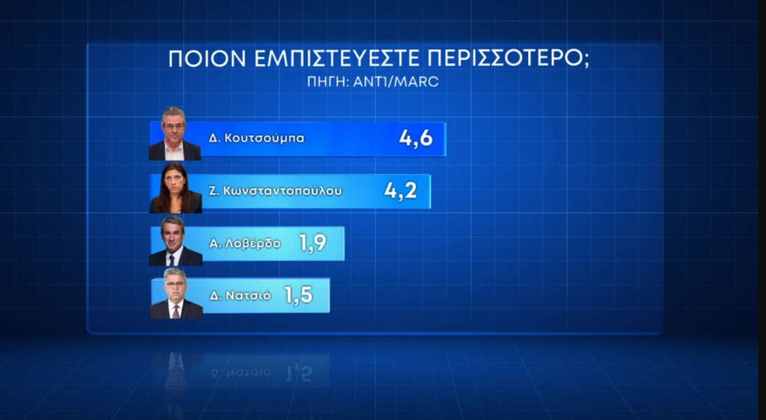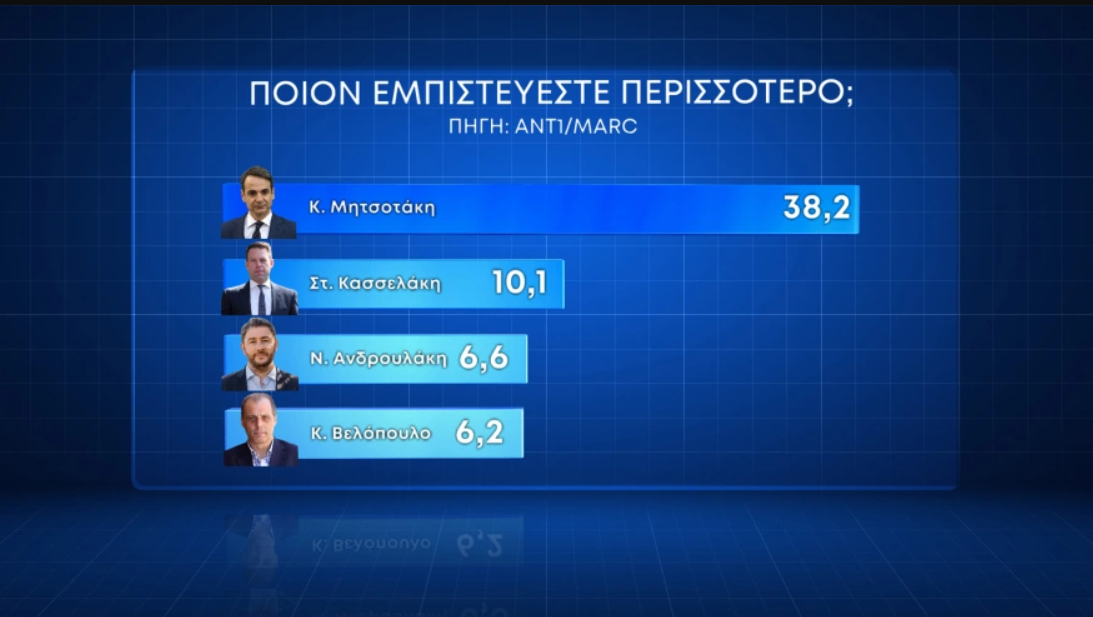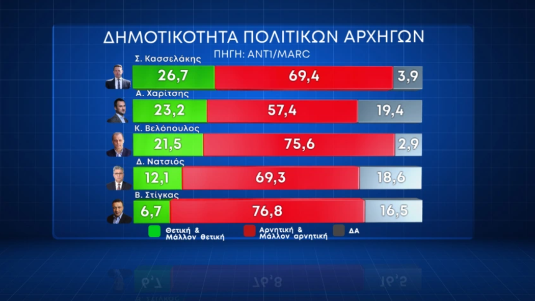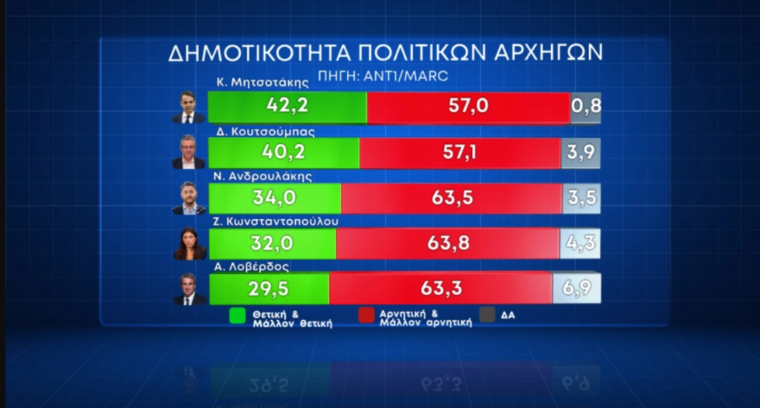 Πρώτος έρχεται ο Κυριάκος Μητσοτάκης με 42,2% θετικές γνώμες, δεύτερος ο Κουτσούμπας με 39, τρίτος ο Νίκος Ανδρουλάκης με 33%.