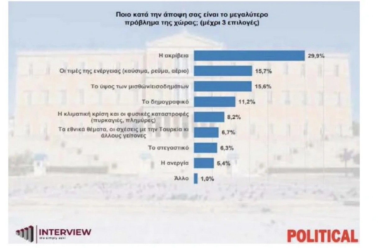 Στα ποιοτικά χαρακτηριστικά της δημοσκόπησης η ακρίβεια είναι το νούμερο ένα πρόβλημα της χώρας σε ποσοστό 29,9%. Το δεύτερο μεγάλο ζήτημα είναι οι τιμές της ενέργειας (καύσιμα, ρεύμα και αέριο) και ακολουθούν το ύψος των μισθών, το δημογραφικό, η κλιματική κρίση και οι φυσικές καταστροφές, τα εθνικά θέματα, το στεγαστικό και η ανεργία.
