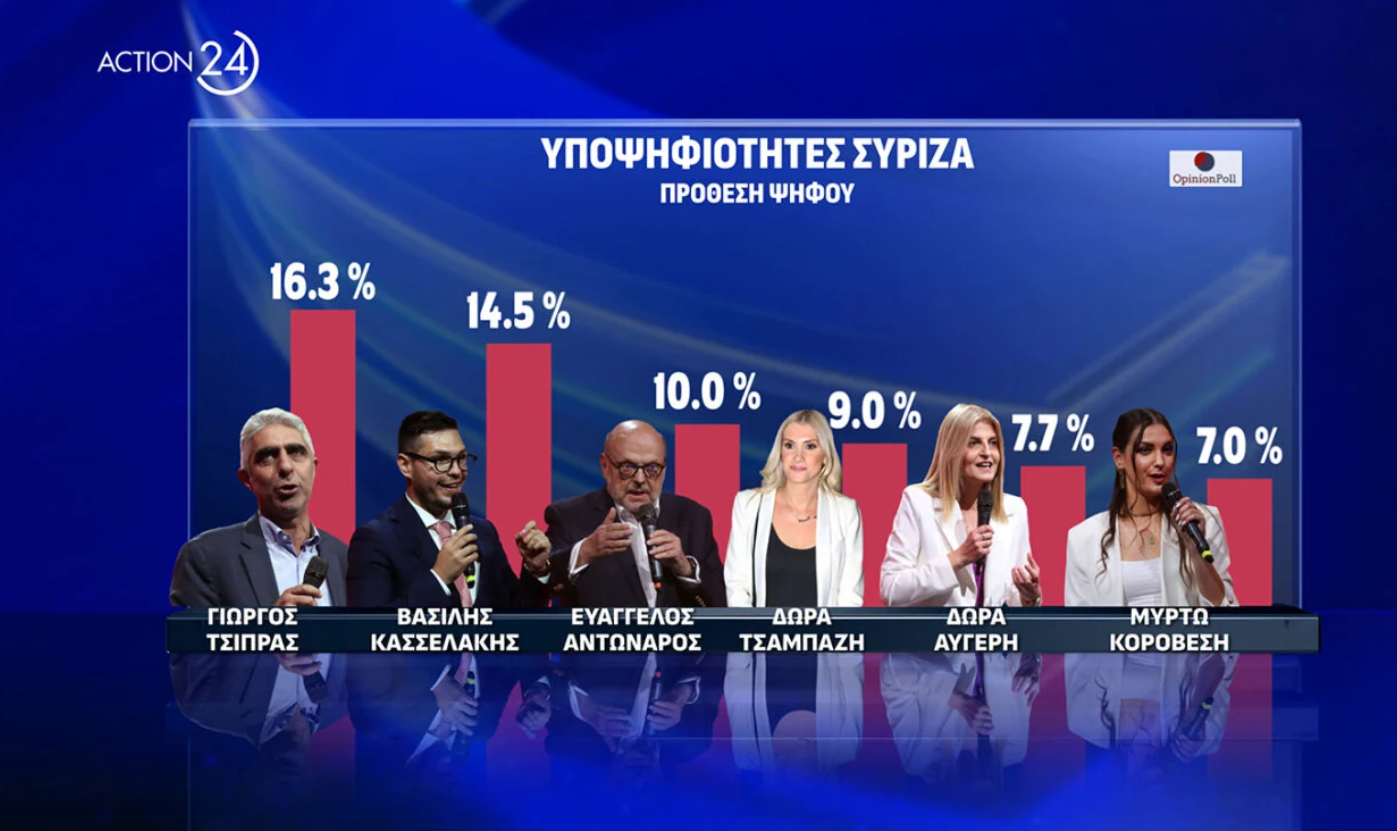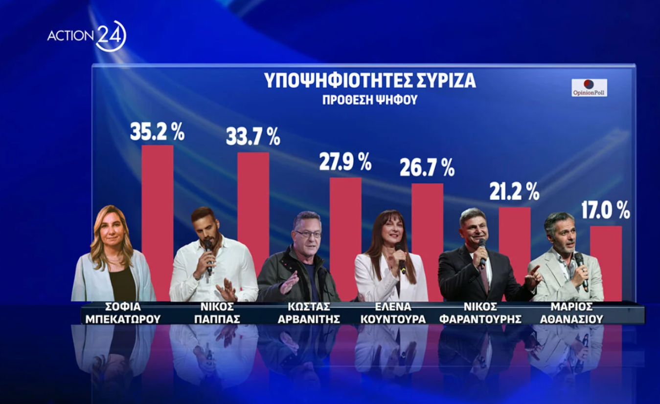 Στον ΣΥΡΙΖΑ, ση Σοφία Μπεκατώρου βρίσκεται στην πρώτη θέση με ποσοστό 35,2%, ενώ ακολουθούν ο Νίκος Παππάς με 33,7%, ο Κώστας Αρβανίτης με 27,9%, η Έλενα Κουντουρά με 26,7%, ο Νίκος Φαραντούρης με 21,2%, ο Μάριος Αθανασίου με 17%, ο Γιώργος Τσίπρας με 16,3%, ο Βασίλης Κασσελάκης με 14,5%, ο Ευάγγελος Αντώναρος με 10%, η Δώρα Τσαμπάζη με 9%, η Δώρα Αυγέρη με 7,7% και η Μυρτώ Κοροβέση με 7%.