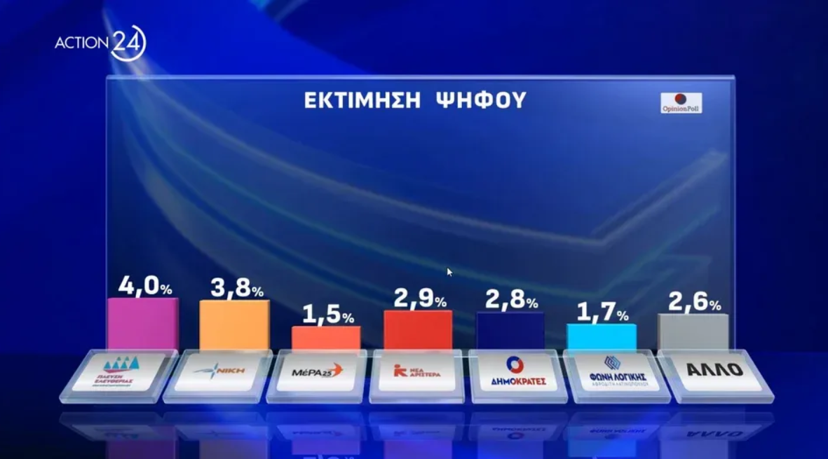 Νέα δημοσκόπηση της Opinion Poll ενόψει των ευρωεκλογών μετέδωσε απόψε ο τηλεοπτικός σταθμός Action 24.