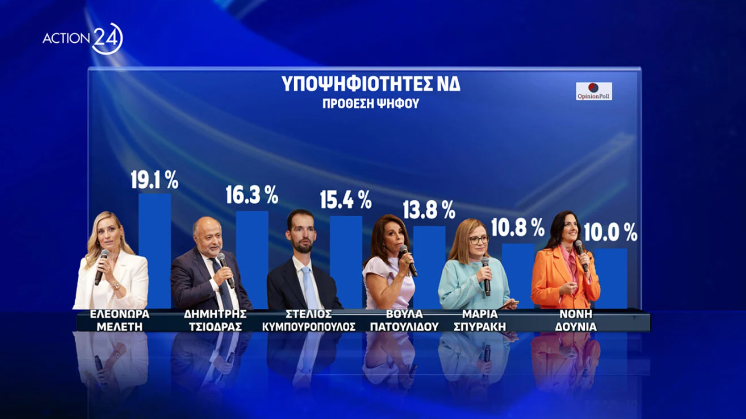 Στη Νέα Δημοκρατία, πρώτος εμφανίζεται ο Γιώργος Αυτιάς με 41,4%, ενώ ακολουθούν ο Πύρρος Δήμας με 28,5%, ο Βαγγέλης Μεϊμαράκης με 27,4%, η Ελίζα Βόζενμπεργκ με 25,6%, ο Φρέντυ Μπελέρης με 21,7%, ο Μανώλης Κεφαλογιάννης με 19,7%, η Ελεονώρα Μελέτη με 19,1%, ο Δημήτρης Τσιόδρας με 16,3%, ο Στέλιος Κυμπουρόπουλος με 15,4%, η Βούλα Πατουλίδου με 13,8%, η Μαρία Σπυράκη με 10,8% και η Νόνη Δούνια με 10%.