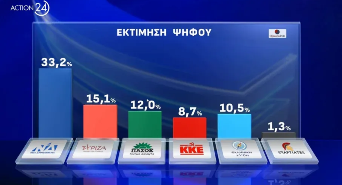 Νέα δημοσκόπηση της Opinion Poll ενόψει των ευρωεκλογών μετέδωσε απόψε ο τηλεοπτικός σταθμός Action 24.