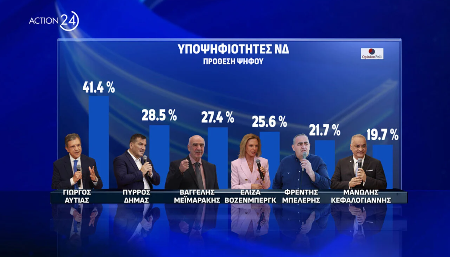 Στη Νέα Δημοκρατία, πρώτος εμφανίζεται ο Γιώργος Αυτιάς με 41,4%, ενώ ακολουθούν ο Πύρρος Δήμας με 28,5%, ο Βαγγέλης Μεϊμαράκης με 27,4%, η Ελίζα Βόζενμπεργκ με 25,6%, ο Φρέντυ Μπελέρης με 21,7%, ο Μανώλης Κεφαλογιάννης με 19,7%, η Ελεονώρα Μελέτη με 19,1%, ο Δημήτρης Τσιόδρας με 16,3%, ο Στέλιος Κυμπουρόπουλος με 15,4%, η Βούλα Πατουλίδου με 13,8%, η Μαρία Σπυράκη με 10,8% και η Νόνη Δούνια με 10%.