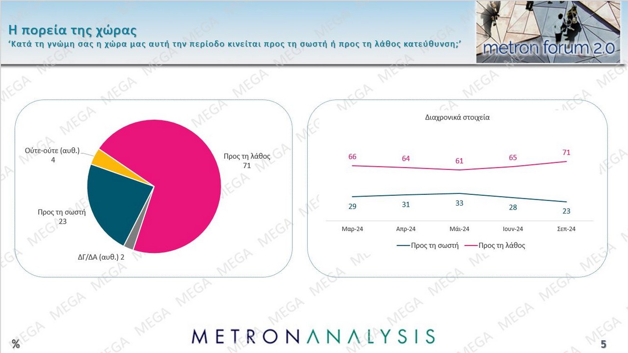Η αύξηση της κοινωνικής δυσαρέσκειας αποτυπώνεται καταρχάς στην απάντηση στο ερώτημα εάν η χώρα κινείται προς τη σωστή ή τη λάθος κατεύθυνση. Και αυτό γιατί το 71% απαντούν ότι κινείται προς τη λάθος κατεύθυνση (από 65% τον Ιούνιο) και μόλις το 23% αναφέρει ότι κινείται στη σωστή κατεύθυνση (από 28% τον Ιούνιο).