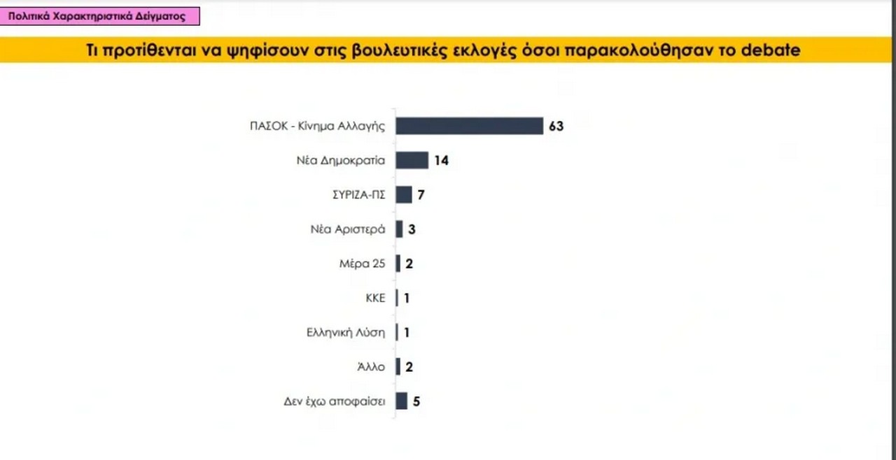Ειδικότερα, στο ερώτημα «Τι προτίθενται να ψηφίσουν στις βουλευτικές εκλογές όσοι παρακολούθησαν το debate», τα αποτελέσματα της δημοσκόπησης είναι: