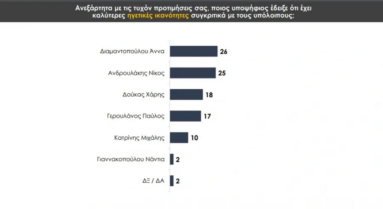 Στην ερώτηση «Ανεξάρτητα με τις τυχόν προτιμήσεις σας, ποιος υποψήφιος έδειξε ότι έχει καλύτερες ηγετικές ικανότητες συγκριτικά με τους υπόλοιπους;», τα αποτελέσματα της δημοσκόπησης είναι τα εξής: